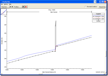 An advantage of running a step-down scheme hotstart run is the ability to spatially evaluate stability issues with difficult reaches. One of the elemental features of the step-down scheme is the artificially raising of the downstream boundary during the hotstart simulation to “drown-out” the reach and effectively create a very stable environment. During the hotstart simulation period, problem areas will identify themselves as the water surface elevation slowly lowers itself into a realistic solution. This is a great way to diagnose instability issues. However, if you have bridges or culverts, drowning-out the reach creates water surface elevations that are much higher than the normal water surface range you’d expect at those bridges, and a normal set of HTab parameters may not work well during the initial period of your hot start simulation. I’m speaking specifically about the “Head water maximum elevation” HTab parameter that is required at bridges and culverts. The figure below shows the problem that occurs with a normal headwater maximum elevation during a step-down hotstart run. Notice the flat pool downstream of the 3rd bridge, followed by a severe drop in water surface elevation. In a good hotstart simulation, the downed-out reach should show a consistently level water surface elevation. Ultimately this hotstart simulation crashed.
